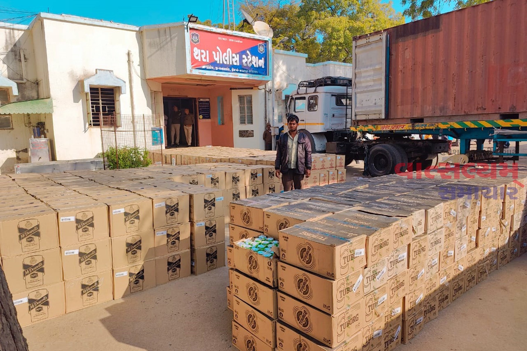 કન્ટેનર ઉભુ રખાવી તપાસ કરતાં કન્ટેનર માં વિદેશી દારૂ ભરેલ હોવાનુ જણાઈ આવ્યુ હતુ.જેની ગાંધીનગર સ્ટેટ મોનિટરીંગ સેલની ટીમ દ્વારા દારૂ ભરેલ કન્ટેનરને થરા પોલિસ મથકે લાવી કન્ટેનર માં રહેલ દારૂની બોટલ નંગ-૧૯,૮૮૪ કિ.રૂપિયા ૬૩,૩૨,૫૨૦/-,મોબાઈલ ફોન નંગ-૧ કિ.રૂપિયા ૫૦૦/-તેમજ રોકડા રૂપિયા ૮૨૦/-,કન્ટેનર નંબર આર.જે.૨૬ જી.એ.-૪૨૭૩ નંબરનુ કન્ટેનર જેની કિરૂપિયા ૩૦,૦૦,૦૦૦/- ,તુટેલા સીલ નંગ-૩, આધારકાર્ડ, બિલ્ટીના કાગળો વગેરે મળી કુલ મુદામાલ ૯૩,૩૩,૮૪૦/-નો સાથે મળી આવેલ અને જે પકડાયેલ તથા નહી પક્ડાયેલ આરોપીઓએ એકબીજાને મદદગારી કરી તમામ ભેગા મળી ગેરકાયદેસર રીતે વિદેશી દારૂ ની હેરાફેરી કરી ખરીદ વેચાણ કરી ગુનો કરતાં એક આરોપીને કન્ટેનર સાથે પક્ડી પાડી થરા પોલિસ સ્ટેશન લાવી પ્રોહિબિશન એકટ હેઠળ ગુનો નોધી અટક કરેલ છે.આવડી મોટી માત્રમાં દારૂનો જથ્થો ઝડપાતા ચકચાર ફેલાઈ હતી.