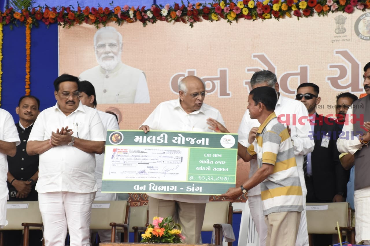 દરમિયાન મુખ્યમંત્રીશ્રીના હસ્તે માલકી યોજના હેઠળ દક્ષિણ ડાંગ વિભાગના વઘઈ રેંજમાં લાભાર્થી શ્રી લક્ષ્મણભાઈ મલુગામ ગાવિત-જામલાપાડાને રૂ.૧૦,૨૨,૮૫૭/-, ચીખલી રેંજમાંથી શ્રી અર્જુનભાઈ ચીમનભાઈ પાલવા-ગુંદવહળ જેમને રૂ.૮,૩૬,૮૬૯/- તથા વઘઈ શ્રીમતિ શરૂબેન બનસ્યાભાઈ પવાર-ઉગાચિચપાડા જેમને રૂ.૪,૫૬,૯૫૬/- ના ચેક અર્પણ કર્યા હતા.