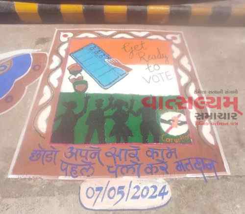 લોકસભા સામાન્ય ચુંટણી – ૨૦૨૪ અંતર્ગત તા. ૦૭/૦૫/૨૦૨૪ના રોજ મતદાન થનાર છે. ત્યારે દેવભૂમિ દ્વારકા જિલ્લાના કોઈપણ મતદાતા મતદાનથી વંચિત ન રહે તે માટે જિલ્લા ચુંટણી અધિકારીશ્રી અને જિલ્લા કલેકટર શ્રી જી.ટી.પંડ્યાના માર્ગદર્શન હેઠળ મતદાન જાગૃતિ કાર્યક્રમો યોજવામાં આવી રહ્યા છે. ત્યારે પ્રજાજનો ધર્મની સાથે સાથે મતદાન કરી લોકશાહીના અવસરમાં ભાગીદાર થઈ નાગરિક ધર્મ પણ નિભાવે તે માટે ભગવાન શ્રી કૃષ્ણ અને રૂક્ષ્મણી વિવાહ સત્કાર સમારોહ અંતર્ગત યોજાયેલી શોભાયાત્રાના રૂટ ઉપર મતદાન કરવા પ્રેરણા આપતી રંગોળી દોરવામાં આવી હતી.