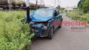 દાહોદનાં બી કેબીન વિસ્તાર નજીક બેકાબુ બનેલી ફોર વ્હિલ ગાડીએ ત્રણ લોકોને જીવ બચાવ્યા ફોર વ્હિલ ગાડી વીજ થામલા સાથે અથડાઈ