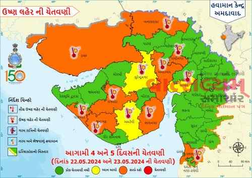 રાજ્યમાં હજુ 23 તારીખ સુધી ભયંકર ગરમી અને લુનું એલર્ટ છે. હવામાન વિભાગની આગાહી અનુસાર, અગામી પાંચ દિવસ રાજ્યમાં ગરમીનું મોજુ ફરી વળશે. તારીખ 19 થી 23 મે સુધી રાજ્યના કચ્છ, બનાસકાંઠા, ગાંધીનગર, રાજકોટ, ભાવનગર, જૂનાગઢ, પોરબંદર, વલસાડ, અમરેલી, આણંદ, સુરેન્દ્રનગરમાં ઉષ્ણ લહેરની ચેતવણી કરાઈ છે. રાજ્યમાં કચ્છ, સુરેન્દ્રનગર, પોરબંદર, જુનાગઢ, ભાવનગર અને વલસાડમાં યલો એલર્ટ જાહેર કરાયું છે.