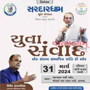 સરદાર ધામ યુવા સંગઠન દ્વારા તા. ૩૧ માર્ચને રવિવારે સાંજે ૫ કલાકે આગમન પાર્ટી પ્લોટ, મોરબી ચાર રસ્તા પાસે હળવદ ખાતે યુવા સંવાદ કાર્યક્રમ યોજાશે