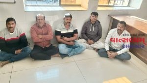 મળતી માહિતી અનુસાર મોરબી એ ડિવિઝન પોલીસે પૂર્વ બાતમીને આધારે મોરબી શહેરના મધ્યે આવેલ જુના બસ સ્ટેન્ડ નજીક સરદાર રોડ ધરતી ટાવરમાં આવેલ ‘ભવાની એક્સપ્રેસ નામની આંગડિયાની ઓફિસમાં દરોડો પાડી તીનપત્તીનો જુગાર રમતા મહેશભાઇ રમણલાલ પટેલ ઉવ.૪૫ રહે.મોરબી આલાપરોડ શીવરંજની એપાર્ટમેન્ટ બ્લોકનં.૭૦૧ મુળરહે.બલોલ તાજી.મહેસાણા, ભીખાજી ઉર્ફે ભાણો દિવાનજી ઠાકોર ઉવ.૩૬ રહે.મોરબી શનાળારોડ ડાર્વીન એપાર્ટમેન્ટ ફલેટ નં.૨૦૨ મુળરહે.નોરતા તા.જી.પાટણ, દીલીપભાઇ રામાભાઇ પટેલ ઉવ.૪૦ રહે.મોરબી ધરતીટાવર મણીલાલ મગનલાલની ઓફીસમા મુળરહે.બોદલા તા.જી.મહેસાણા, સંજયકુમાર અંબાલાલ પટેલ ઉવ.૪૦ રહે.મોરબી વાવડીરોડ ગાયત્રીનગર સોસાયટી મુળરહે.સોપાડા તા.વિજાપુર જી.મહેસાણા, ભાવેશકુમાર ચંદુલાલ પટેલ ઉવ.૪૨ રહે.મોરબી વાવડીરોડ ઉમીયાપાર્ક સોસાયટી મુળરહે.બોદલા તા.જી.મહેસાણાને જુગાર રમતા રંગેહાથ ઝડપી લેવામાં આવ્યા હતા. પોલીસે દરોડા દરમિયાન જુગારના પટ્ટમાંથી રોકડા રૂ.૧,૦૦,૩૦૦/- કબ્જે લઇ પાંચેય આરોપીઓ સામે ધોરણસરની કાર્યવાહી હાથ ધરી છે.