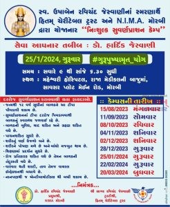 : સ્થળ મહેશ્વરી હોસ્પિટલ રાજા મેડીકલની બાજુમાં, જુના બસ સ્ટેન્ડ પાસે, સાવસર પ્લોટ મેઈન રોડ, મોરબી.0 થી 12 વર્ષનાં બાળકને મફતમાં સુવર્ણ પ્રાશનનો લાભ અવશ્ય આપો.*