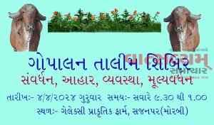 કાર્યક્રમનું આયોજન તારીખ ૪/૪/૨૦૨૪ ને ગુરુવારે ગેલેક્સી પ્રાકૃતિક ફાર્મ, સજનપર(મોરબી)* ખાતે રાખેલ છે. તાલીમમાં ૬૦ થી ૭૦ વ્યક્તિઓનો સમાવેશ વહેલા તે પહેલાના ધોરણે કરવામાં આવશે. તો ગૌશાળા ધરાવતા કે ગૌશાળા કરવા ઇચ્છુક વ્યક્તિઓ રજીસ્ટ્રેશન માટે વહેલી તકે મને ૯૪૨૬૨૩૨૪૦૦ નંબર પર વોટસએપ કરે. પ્રાકૃતિક ખેતીમાં રસ ધરાવતા લોકો પણ આવકાર્ય છે.