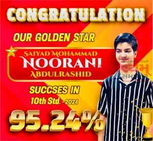 (મોહસીન શેખ દ્વારા મોરબી) મોરબી મુસ્લિમ સમાજના શહેર ખતિબ અબ્દુલ રશીદ મીયા કાદરી ના સહેજાદા સૈયદ મોહમ્મદ નુરાની બાવા ન્યુએરા ઈંગ્લીશ મીડીયમ સ્કૂલ મા ધોરણા૧૦ મા ૯૫.૨૪ % પરીણામ મા આખી સ્કૂલમાં સૈથી ૧ નંબરે સ્થાન મેળવ્યું અને સમગ્ર મુસ્લિમ સમાજનું ગૌરવ વધાર્યું છે