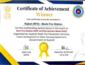 જેમાં મોરબી નગરપાલિકા ફાયર એન્ડ ઇમરજન્સી સર્વિસિસ બેસ્ટ ફાયર સ્ટેશન વર્ષ 2023-24 માટે વિજેતા ઘોષિત થતા અગ્ર સચિવ, શહેરી વિકાસ અને શહેરી ગૃહ નિર્માણ વિભાગ, ગુજરાત રાજ્યના હસ્તે સર્ટિફિકેટ અને મોમેન્ટો અર્પણ કરી સન્માનિત કરવામાં આવેલ છે અને મોરબી ફાયર જવાનોને પ્રોત્સાહિત કર્યા છે. જે બદલ ફાયર એન્ડ ઈમરજન્સી સર્વિસીસ, મોરબી ગર્વની લાગણી અનુભવે છે.