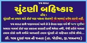(અહેવાલ: જયેશ બોખાણી)જામનગર જિલ્લાના જોડીયા તાલુકા જામ દૂધઇ ગામે ગ્રામજનો દ્વારા ચુંટણીનો બહિષ્કાર કરવામા આવ્યો છે. ગ્રામજનો દ્વારા આગામી તમામ ચૂંટણીનો બહિષ્કાર કરવામાં આવશે તેમજ ચુંટણીના પ્રચાર માટે કોઈ પણ પક્ષના નેતાઓએ ગામમાં પ્રવેશ કરવો નહીં તેવું ગામના મુખ્ય દ્રાર પર પોસ્ટર લગાવવામાં આવ્યું છે.