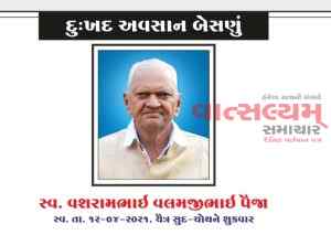 દિલગીરી સાથ જણાવવાનું કે અમારા પિતાશ્રી સ્વ. વશરામભાઈ વલમજીભાઈ પૈજા (ઉ.વ. ૮૩ વર્ષ) સ્વ. તા. ૧૨-૦૪-૨૦૨૧, ચૈત્ર સુદ-ચોથને શુક્રવાર શ્રી રામ ચરણ પામેલ છે.