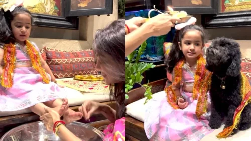 શિલ્પા શેટ્ટી દર વર્ષે દુર્ગા અષ્ટમી પર નવરાત્રિ દરમિયાન કન્યા પૂજા કરે છે. આ વખતે પણ તેણે એવું જ કર્યું. અભિનેત્રીએ પુત્રી સમિષા અને તેના કૂતરાની પૂજા કરી હતી. દુર્ગા અષ્ટમી પર, શિલ્પાએ તેની પુત્રીના પગ ધોયા અને તેમની પૂજા કરી. આનો એક ક્યૂટ વીડિયો તેણે સોશિયલ મીડિયા પર શેર કર્યો છે. નવરાત્રિ પર શિલ્પા શેટ્ટીની માતા દુર્ગા પ્રત્યેની ભક્તિએ તેના ચાહકોનું દિલ જીતી લીધું છે.