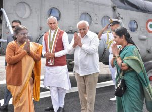 સમારોહ સ્થળ-કરસનજીના આંગણે વૈદિક મંત્રોચ્ચાર સાથે યજ્ઞમાં આહુતિ અર્પણ કરતા રાષ્ટ્રપતિ શ્રીમતી દ્રૌપદી મુર્મુ: રાજ્યપાલશ્રી આચાર્ય દેવવ્રતજી તથા મુખ્યમંત્રીશ્રી ભૂપેન્દ્રભાઈ પટેલે પણ યજ્ઞમાં આહુતિ આપી